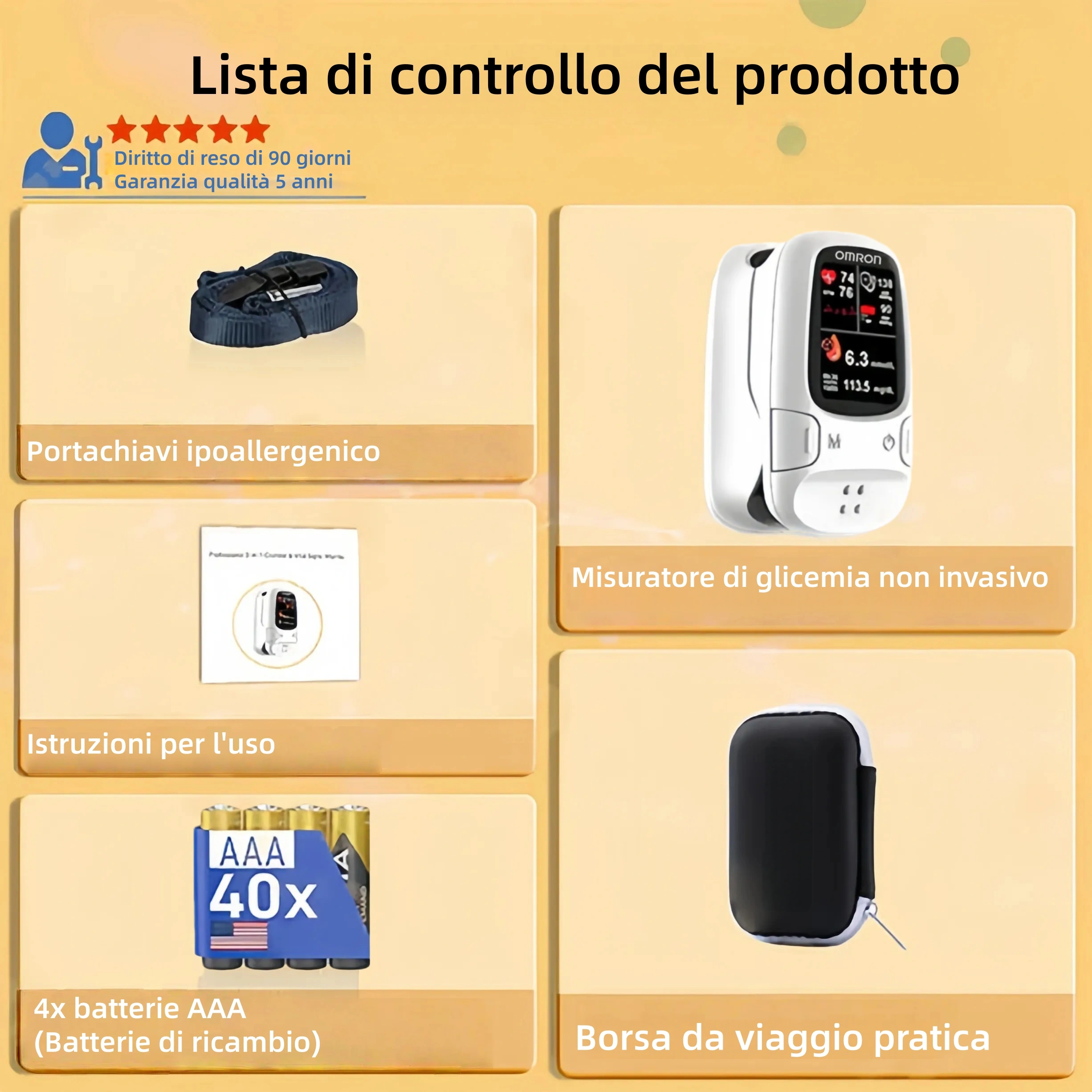 Completamente indolore: basta posizionare l'indice sul dispositivo Omron™ e in 5-8 secondi verranno visualizzati il livello di glicemia, il livello di ossigeno nel sangue e persino la frequenza cardiaca. Veloce e semplice!