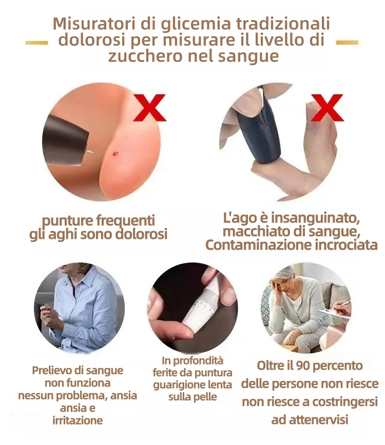 Basta con i test glicemici invasivi e rischiosi! Misura la tua glicemia in modo sicuro, senza il rischio di infezioni crociate o punture di ago alle dita.
