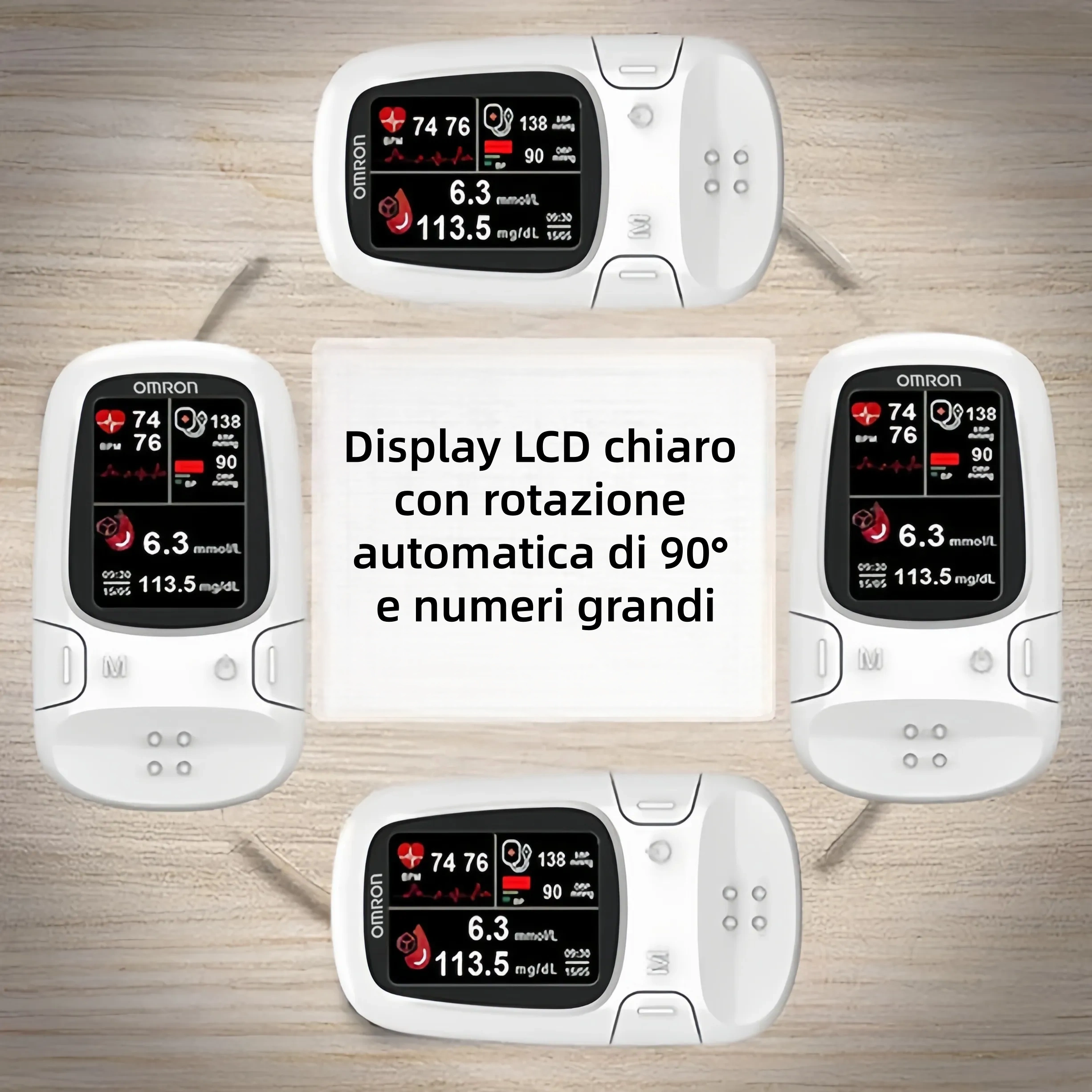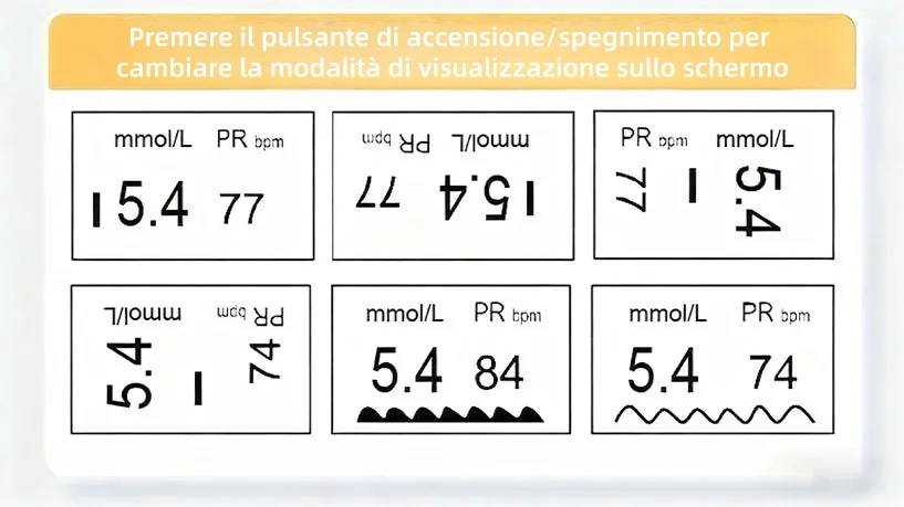 Una volta acceso, il dispositivo Omron™ passa automaticamente da una modalità di visualizzazione all'altra ogni volta che si preme il pulsante di accensione, consentendo di leggere comodamente le letture da qualsiasi angolazione.
