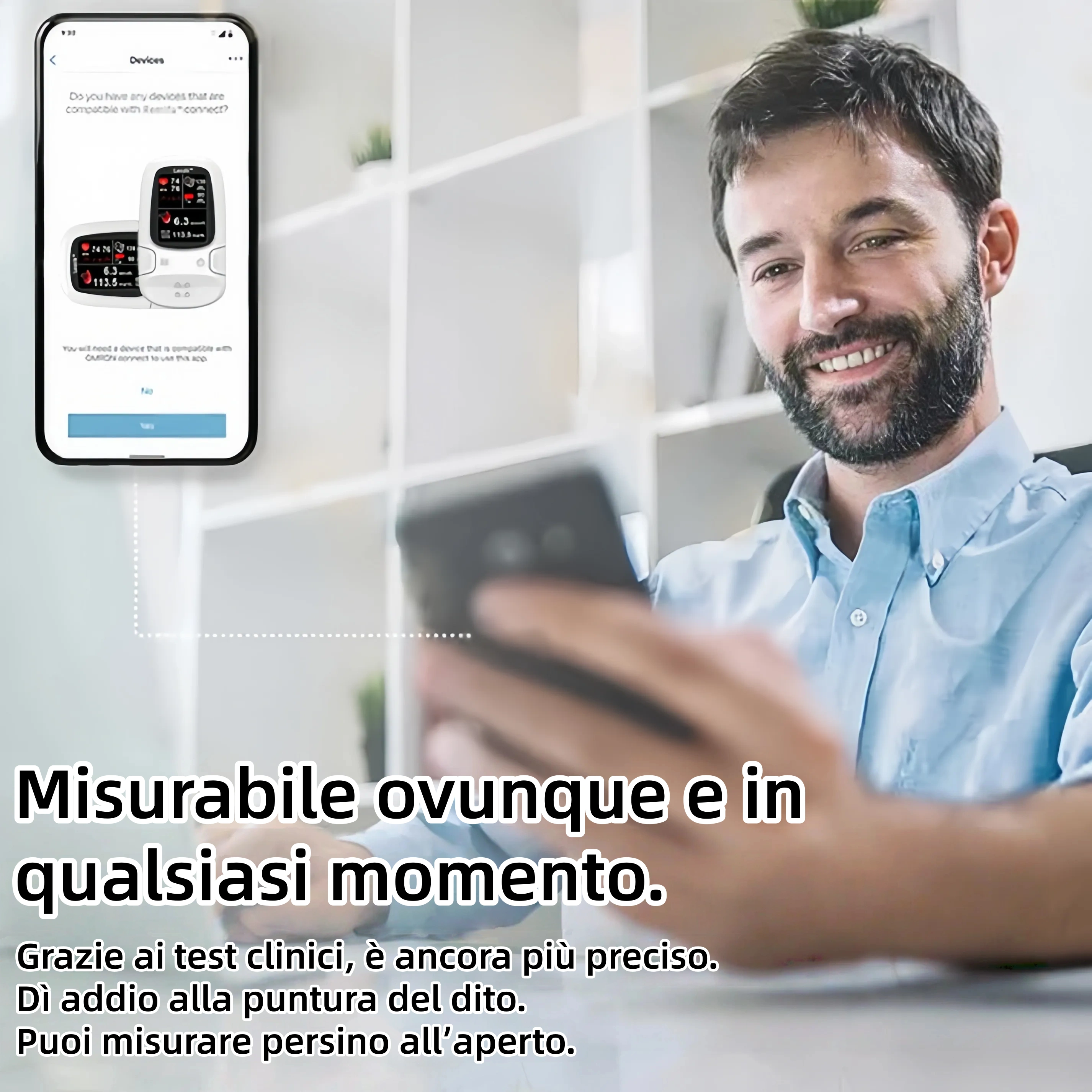 Tecnologia non invasiva e senza punture: misura ovunque, in qualsiasi momento, senza dolore.